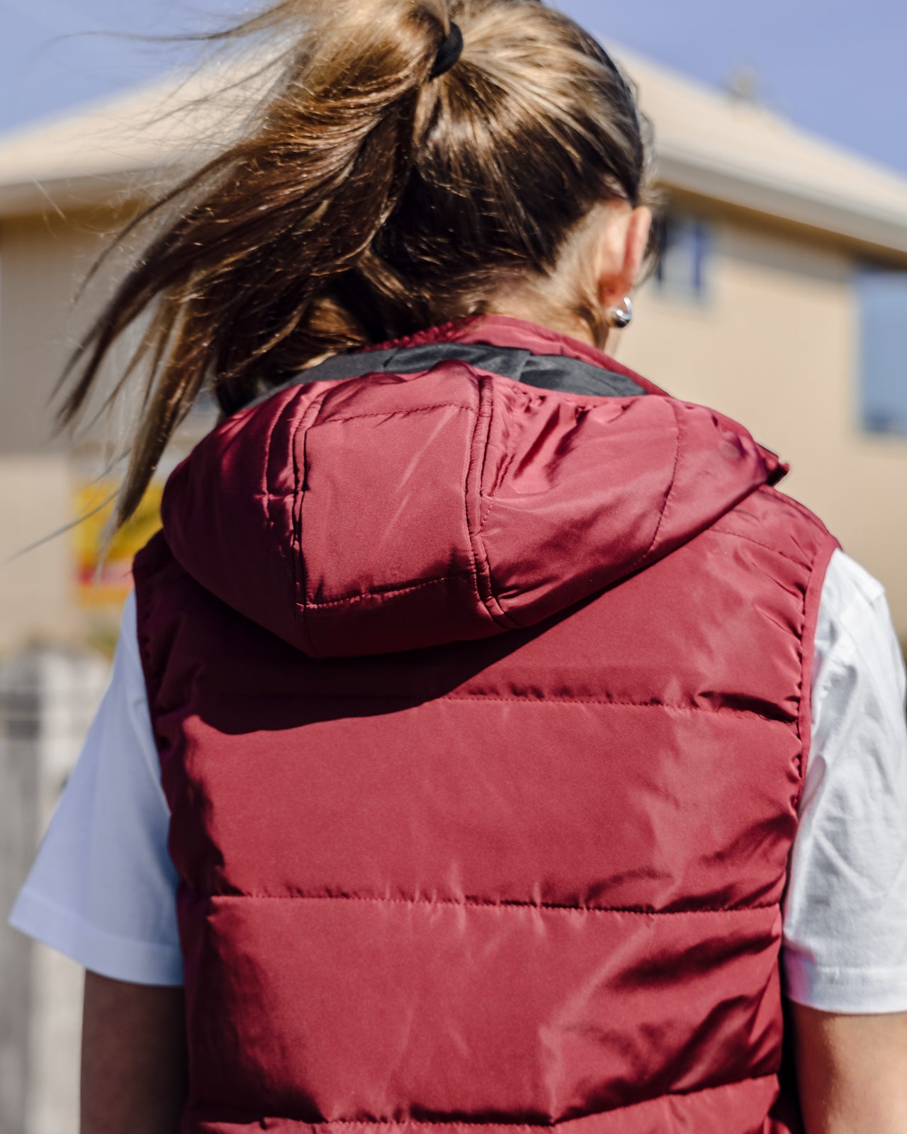 Maroon puffer vest, white WSLSC log, detachable hood.
