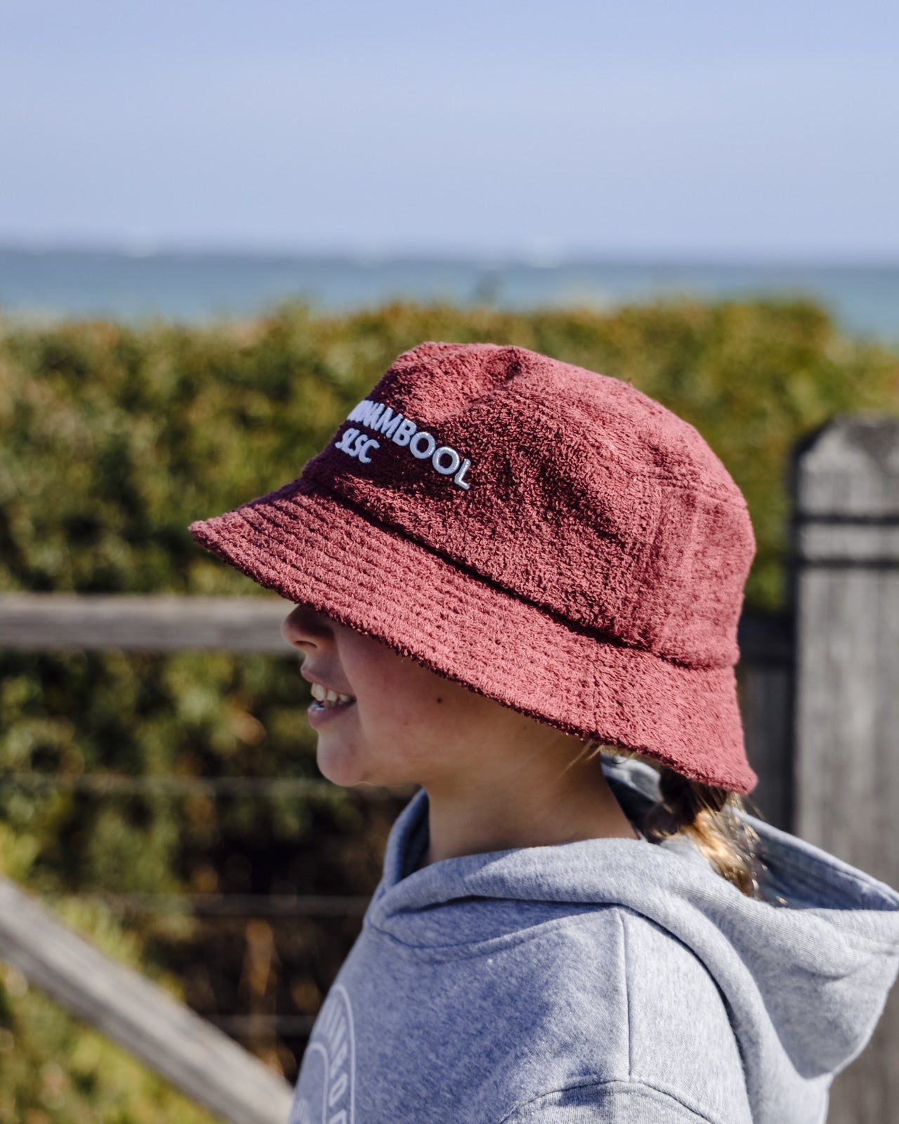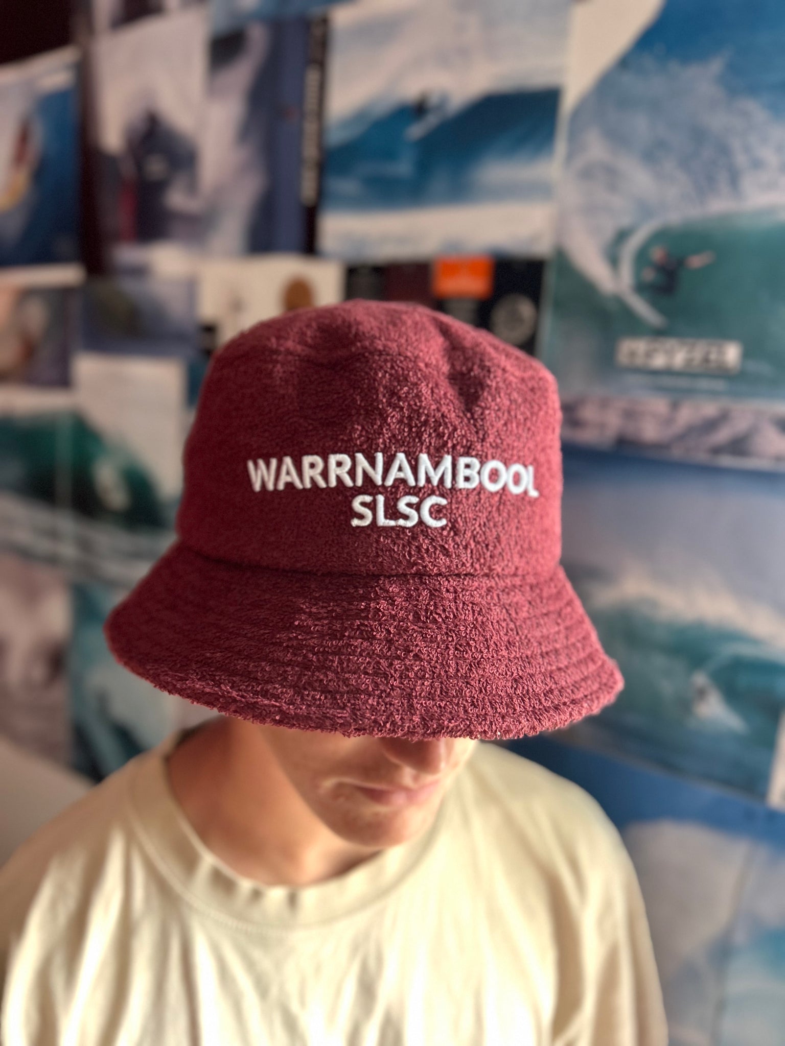 2026 Maroon Terry towelling bucket hat with white WSLSC logo.